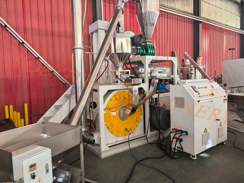 З пункту гледжання прадукцыйнасці, каб забяспечыць якасць прафесійнага ўзроўню, Yongte Plastics Machinery мадэрнізавала тры ключавыя аспекты. У канцы падачы дадаецца модуль папярэдняй пластыфікацыі з падвойнымі зрухавымі ролікамі і распыленым уваходным адтулінай для змякчальніка. Тут выкарыстоўваецца механічны зрух пры 3000-5000 абаротаў у хвіліну ў спалучэнні з дакладным даданнем 1%-3% змякчальніка для зніжэння цвёрдасці гумы з Шора A 60-70 да Шора A 40-50, прынцыпова вырашаючы праблему апрацоўкі высокай эластычнасці гумы, якая абцяжарвае яе раздушванне. Кампаненты драбнення стрыжняў былі мадэрнізаваны да зубчастых ролікаў з пакрыццём з карбіду вальфраму, якія маюць цвёрдасць HRC 70-75 і васьміразовае павышэнне зносаўстойлівасці, эфектыўна супрацьстаячы ўздзеянню рэшткаў сталёвага дроту ў адходах гумы. Сістэма таксама ўключае ў сябе падвойную канструкцыю рэгулявання тэмпературы, якая ўключае спіральную кашулю вадзянога астуджэння і рознанакіраваныя сопла для паветранага астуджэння, што забяспечвае стабільную тэмпературу камеры драбнення ніжэй за 40 °C і значна зніжае ўзровень адгезіі гумовага парашка да сценкі з 30% да менш чым 5%. Акрамя таго, у канцы сістэмы ўбудаваны класіфікатар паветра і вяртанне грубага парашку. Рэгуляваная хуткасць класіфікацыйнага кола 3000-10000 абаротаў у хвіліну дазваляе дакладна кантраляваць тонкасць гатовага прадукту ад 40-120 меш, падтрымліваючы стабільны выхад больш за 95%.