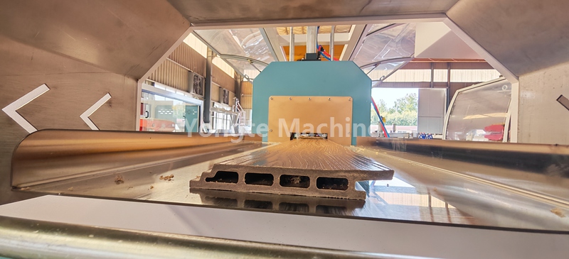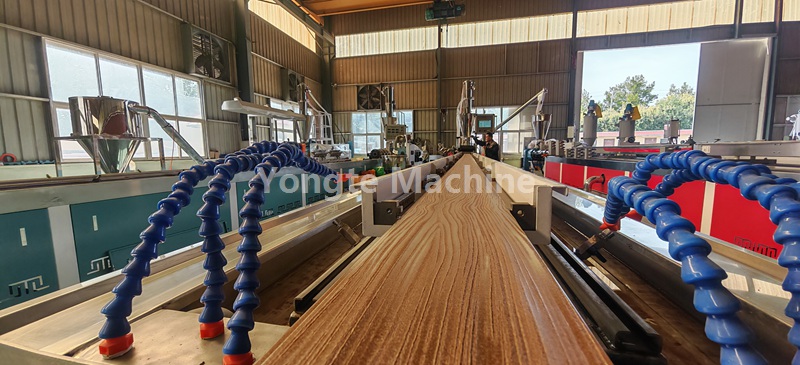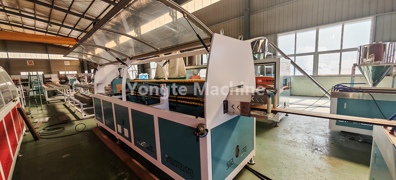 Гэтая лінія экструзіі профілю WPC абсталявана аўтаматычнай вакуумнай сістэмай падачы, высокаэфектыўнай канічнай двухшнекавай экструзійнай сістэмай, сістэмай кіравання PLC, онлайн-машынай для 3D-ціснення, вадзяным і вакуумным астуджэннем і калібравальным сталом, двайным гусенічным адводам, аўтаматычнай рэжучай машынай з пылазборнікам і ўкладчыкам для вырабаў.